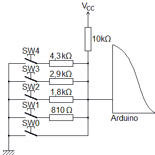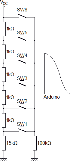 Par exemple si l'on veut 6 boutons, soit 6 boutons pour 1,5V (de 5V à 3,5V), cela ferait 20 boutons pour 5V. On prends le schéma pour 20 boutons, ceal ferait 20 résistances de 1kΩ. On ne garde que les 6 boutons du haut et les 5 résistances de 1kΩ et on remplace les 15 vieilles résistances de 1kΩ par une seule de 15kΩ.