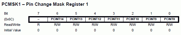 Enfin, il faut dire parmi PCINT[14:8] la ou lesquelles sont autorisées à interrompre. C'est le registre PCMSK1 qui le permet: